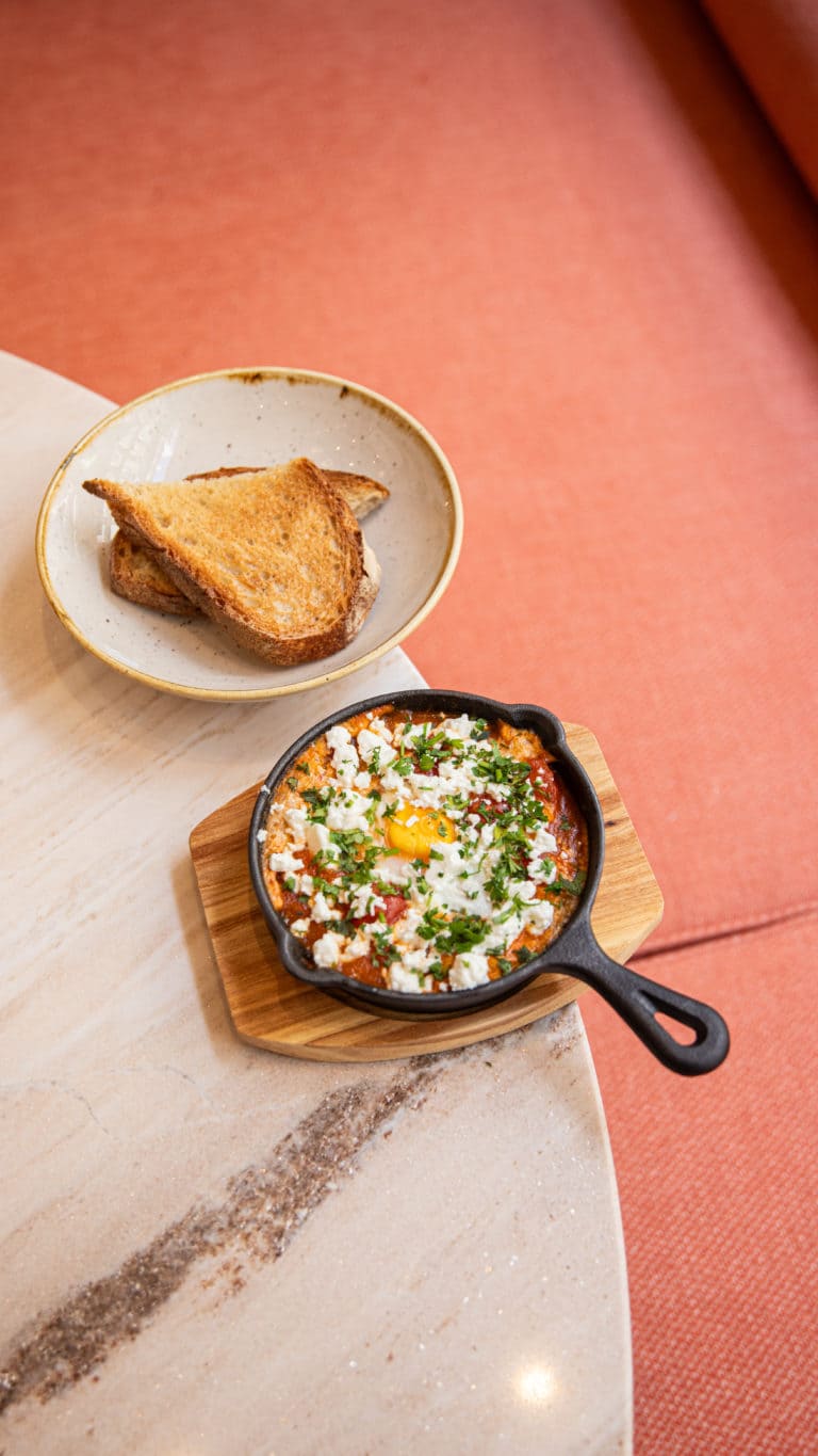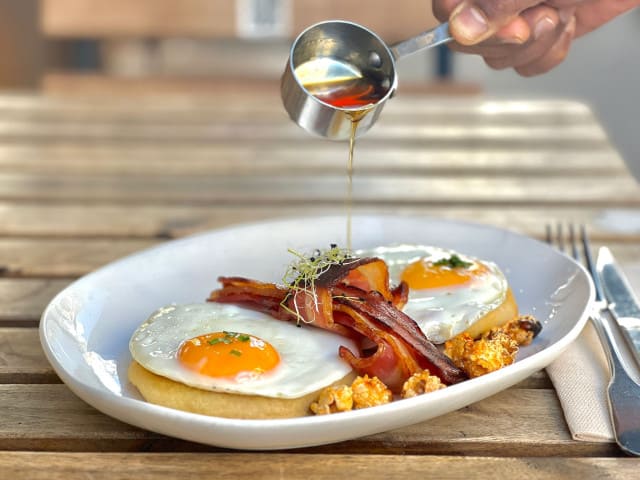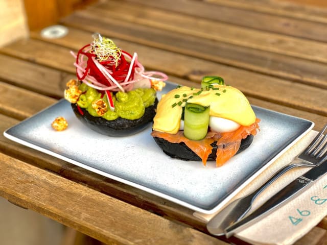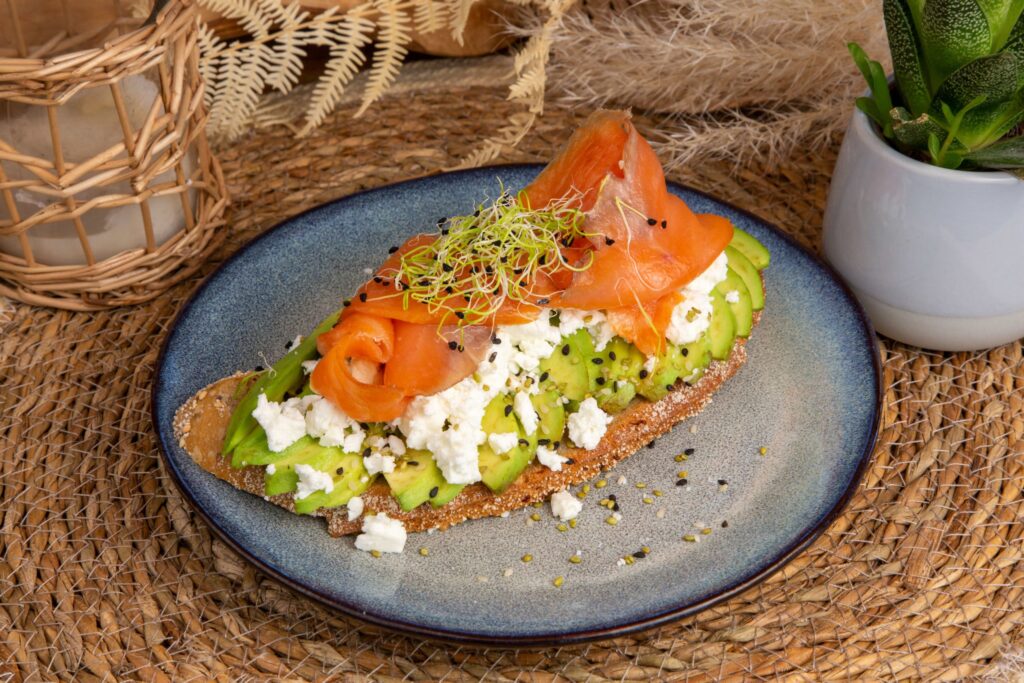 Pain complet, tartiné d’avocat, radis, roquette, et œuf poché avec un filet d’huile d’olive.