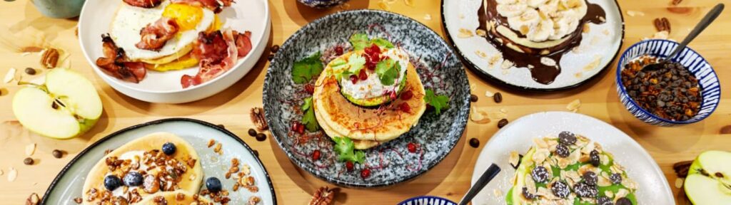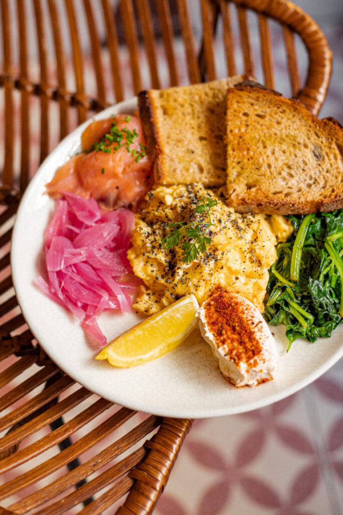 Pancakes légers servis avec saumon fumé, crème fraîche, aneth, et œuf poché.