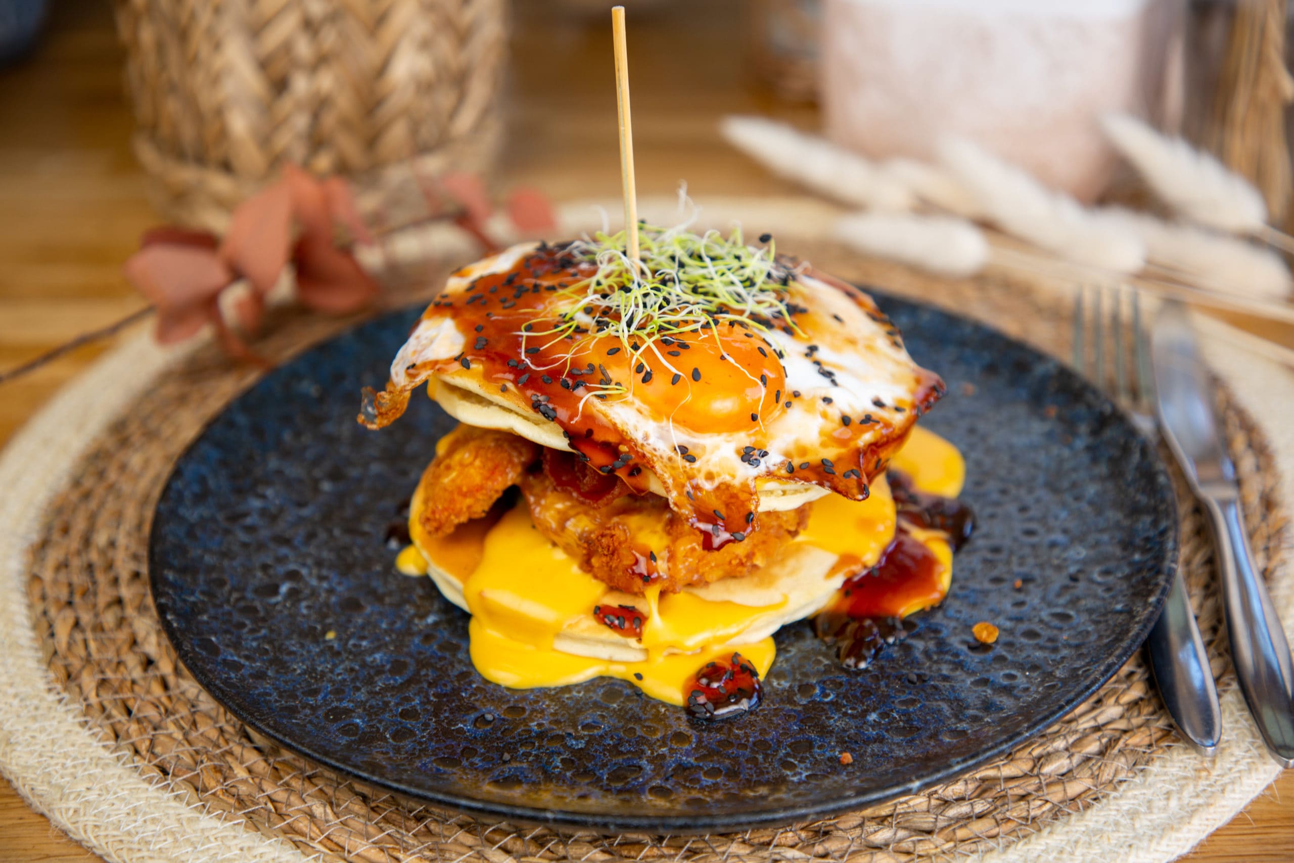 Pancakes accompagnés de tempeh mariné, légumes grillés, et sauce au yaourt aux herbes.