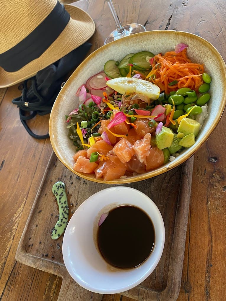 Mélange de légumes rôtis (aubergines, poivrons, courgettes) sur un lit de riz basmati, assaisonné d’une sauce tahini et graines de sésame.