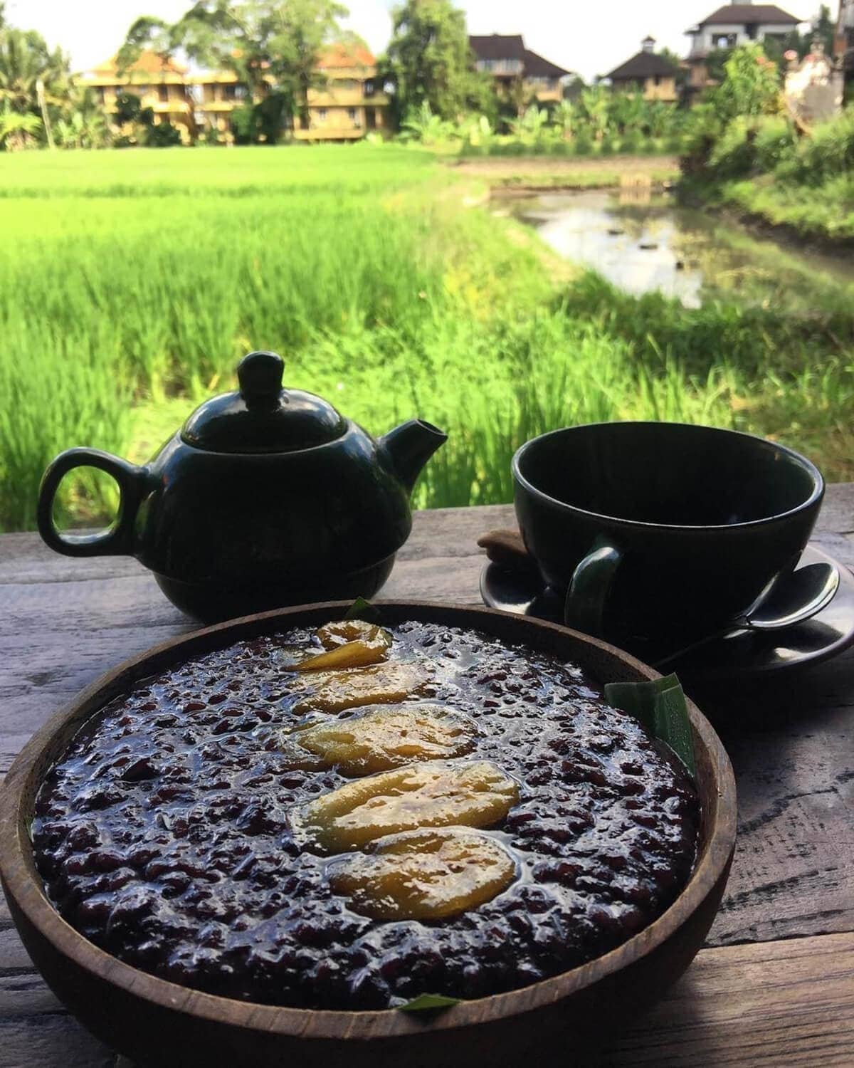 Porridge de riz noir balinais cuit au lait de coco, servi avec une touche de crème et une banane flambée.
