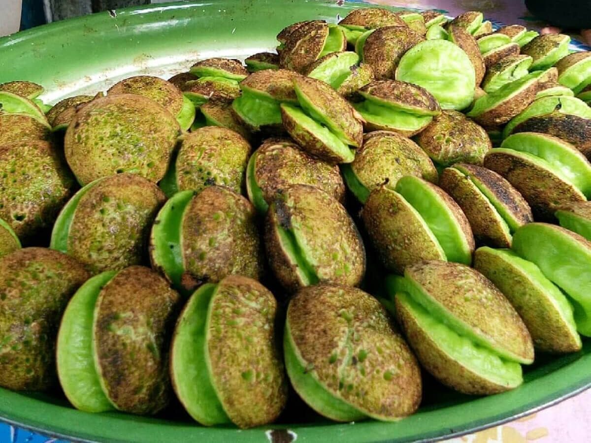 Crêpes vertes balinaises au pandan, garnies de noix de coco râpée caramélisée au sucre de palme.