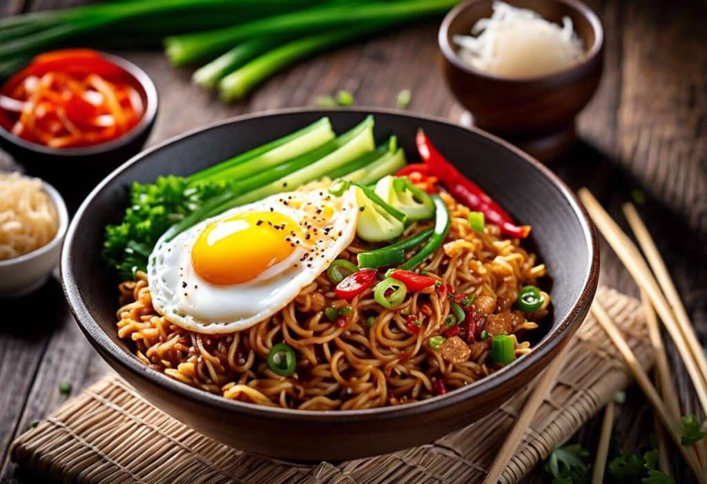 Nouilles sautées aux épices balinaises, crevettes ou tofu, œuf poché, et sauce soja sucrée.